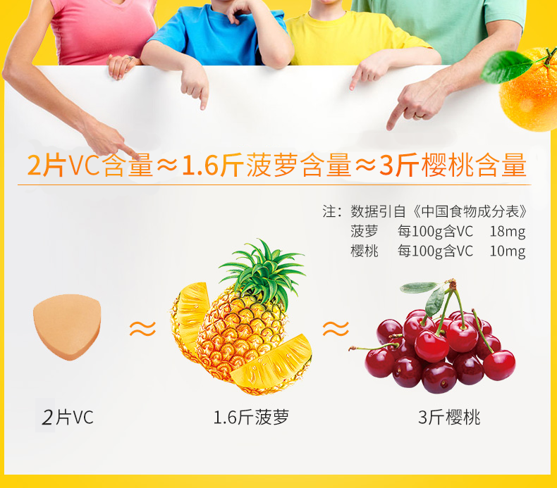 | 成分原料 | 维生素c、甘露醇、葡萄糖、白糖、硬脂酸镁、柠檬酸、聚乙烯基吡咯烷酮、羟丙甲纤维素、二氧化钛、滑石粉、胭脂红、柠檬黄等。 |