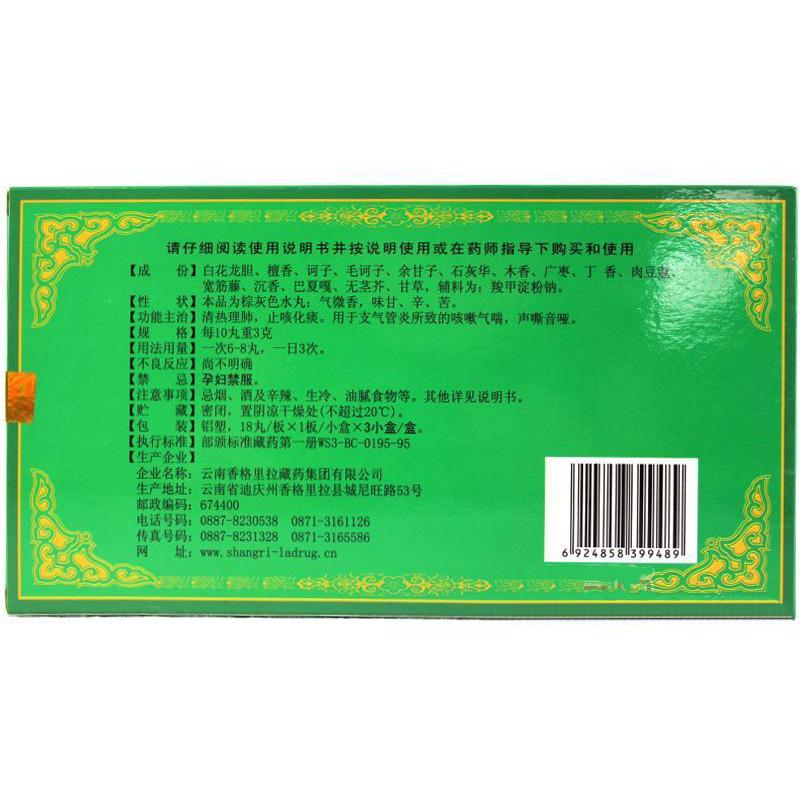 【药品成份】百花龙胆、檀香、诃子(去核)、余甘子、石灰华、广枣丁香、肉豆蔻、沉香、巴夏嘎、无茎芥、甘草味等。