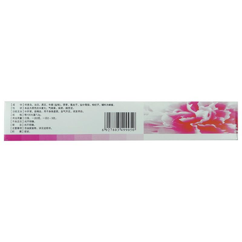 【药品成份】主要成份为何首乌、当归、黑豆、牛膝(盐制)、茯苓、菟丝子、补骨脂(盐制)、枸杞子;辅料为:蜂蜜。