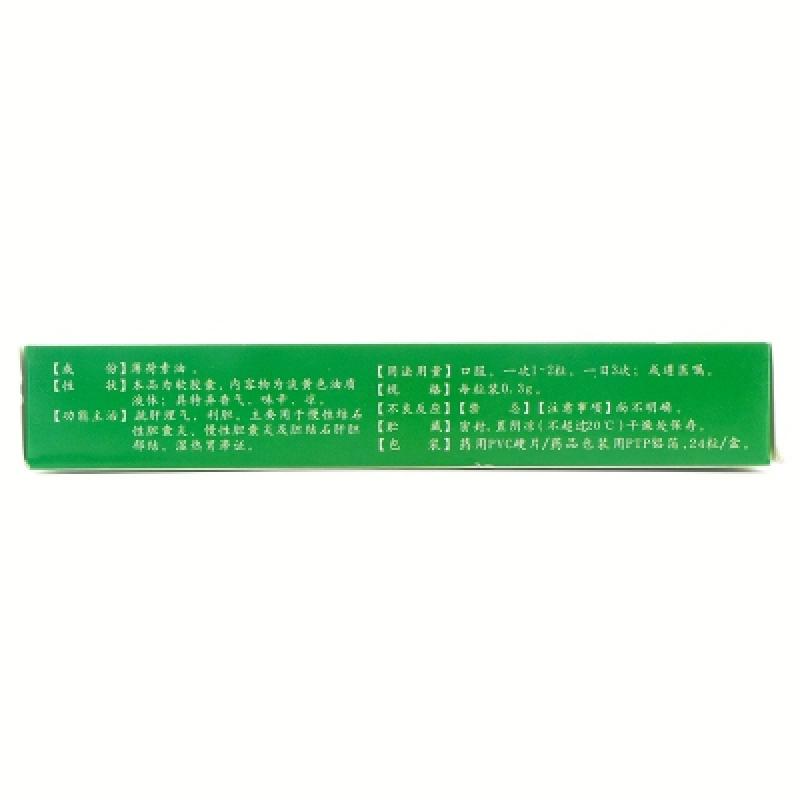 【性 状】本品为软胶囊剂,内容物为油状澄明液体;具特异香气,味辛、凉。